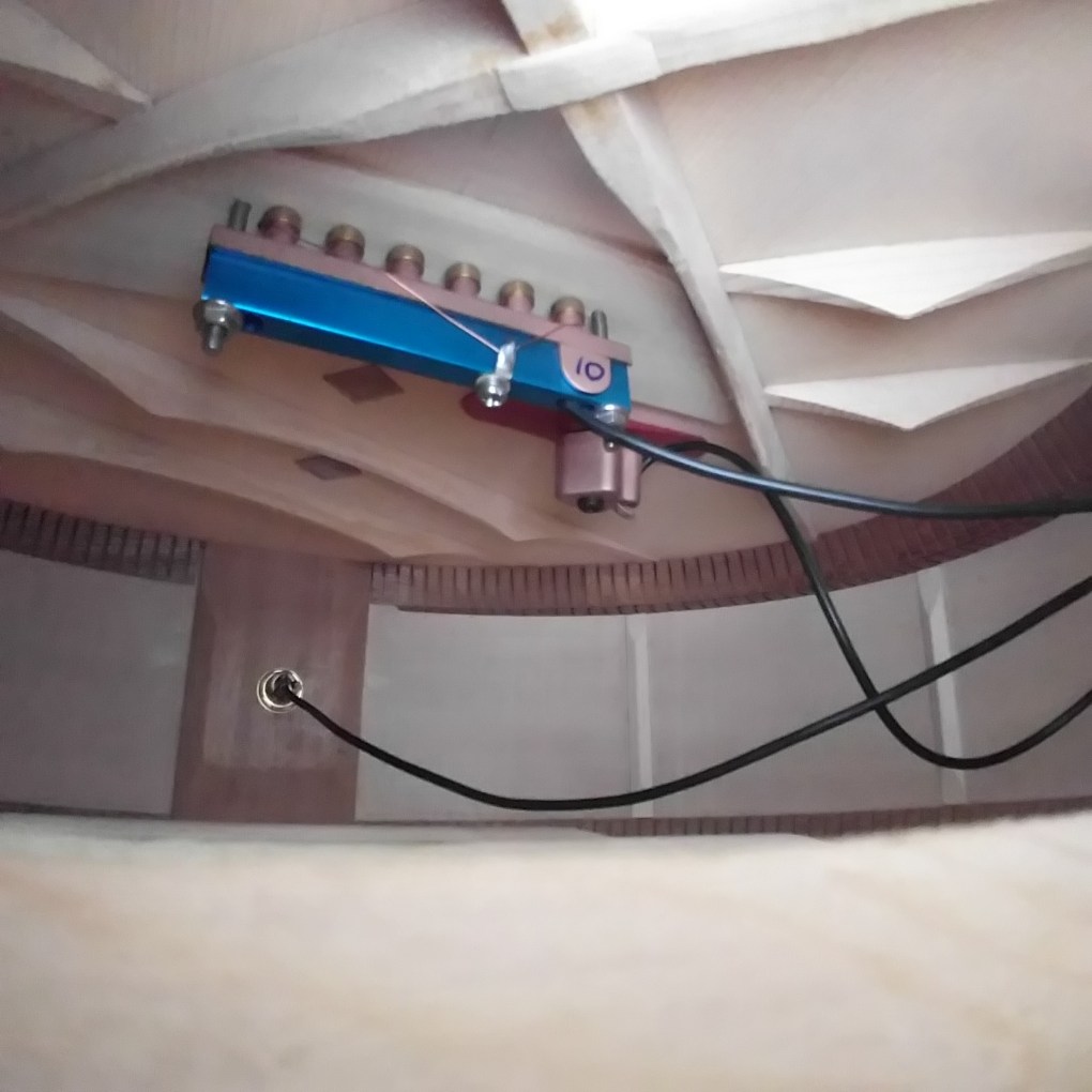 The battery and PCB are mounted to the guitar’s internal heel block to minimise the system’s impact on the instrument, and for ease of installation. No large objects mounted on the guitar’s substrates and no large routed holes in the guitar are a good idea. We wanted to minimise the weight and plastic used.