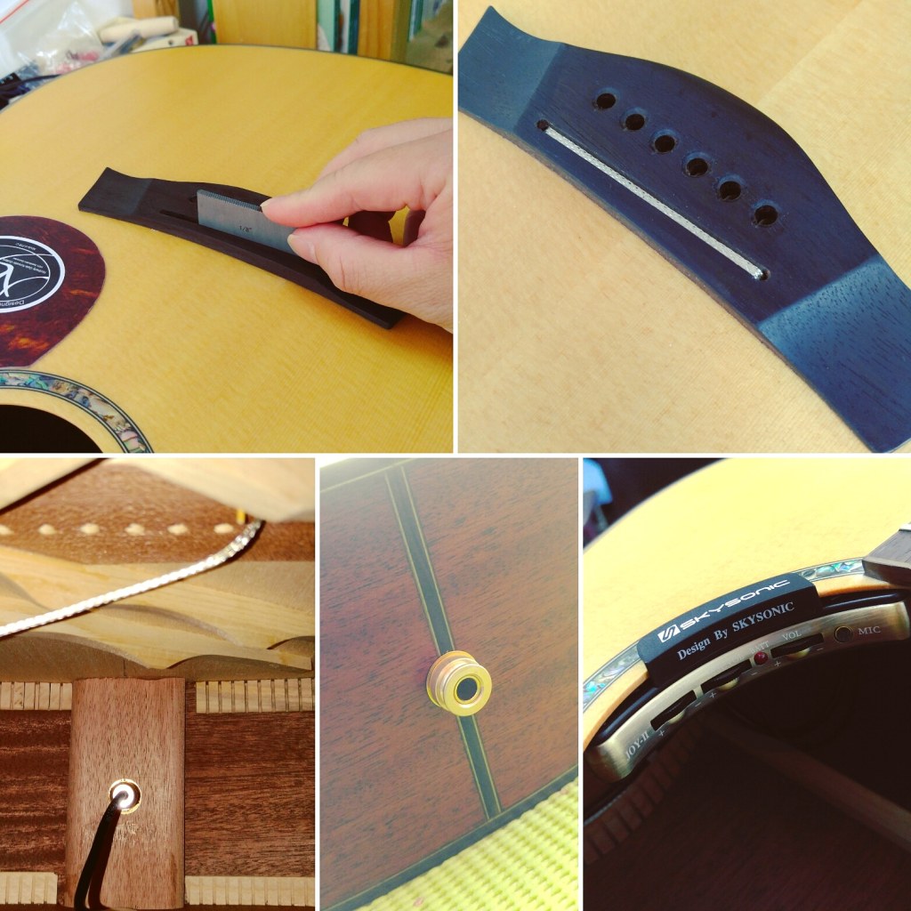 2. 然後在琴橋坑槽中轉一個小洞,讓Skysonic Joy-2的拾音條(Transducer)可以穿過面板,完好地平躺在坑槽內。