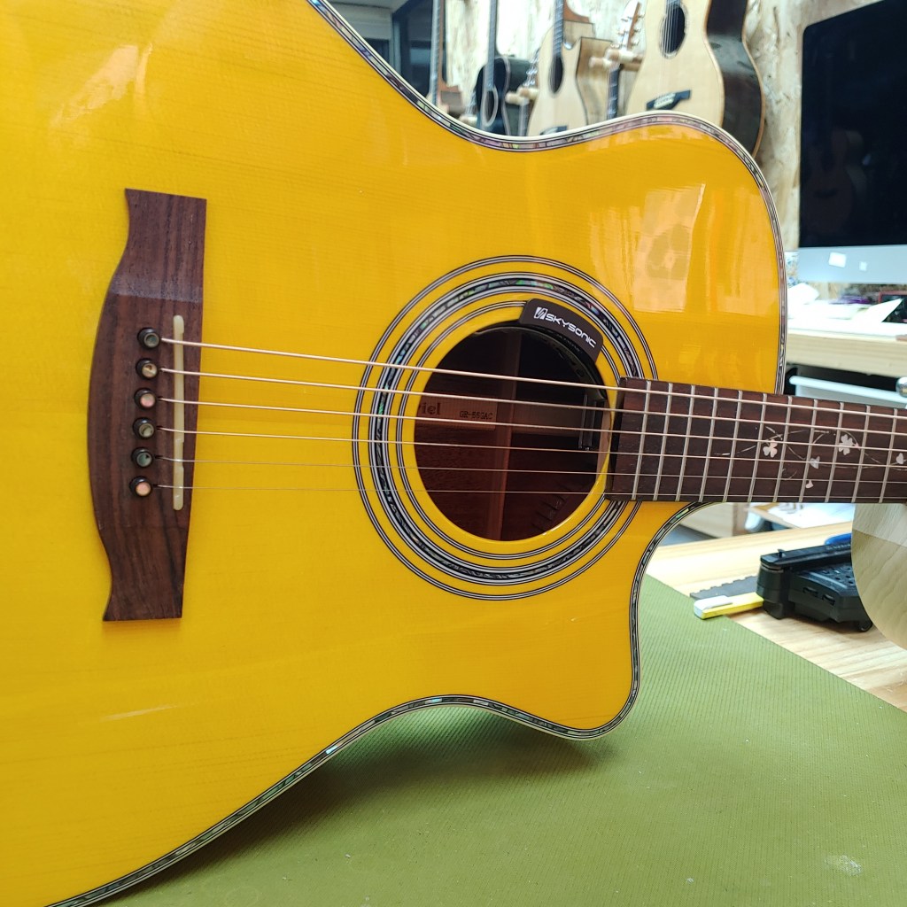 一般的傳統undersaddle pickup需要在琴身側開一個大洞,用來安裝pickup的EQ control,這樣就影響了結他本的結構了。Skysonic Joy-2的設計就避免對結他的不必要損耗,它的EQ可以輕鬆地安置在音孔上,隨時除下來也可以,完全不影響琴身結構。