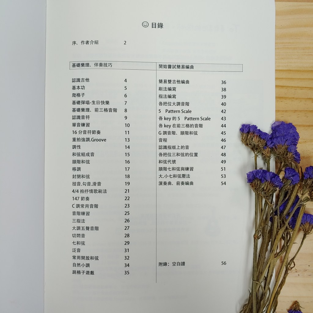 一個單元一面,清楚好記憶,複習時容易翻閱。 60頁不多不少的厚度,不會太有壓力。 教材內容程度:收錄從初階木吉他彈唱(演奏)較常會使用到的樂理,與一點伴奏技巧穿插,到初階編曲會用到的一些知識(目錄請見圖片)。 最後附錄製作了幾種空白譜格式,提供大家影印來寫自己的譜。