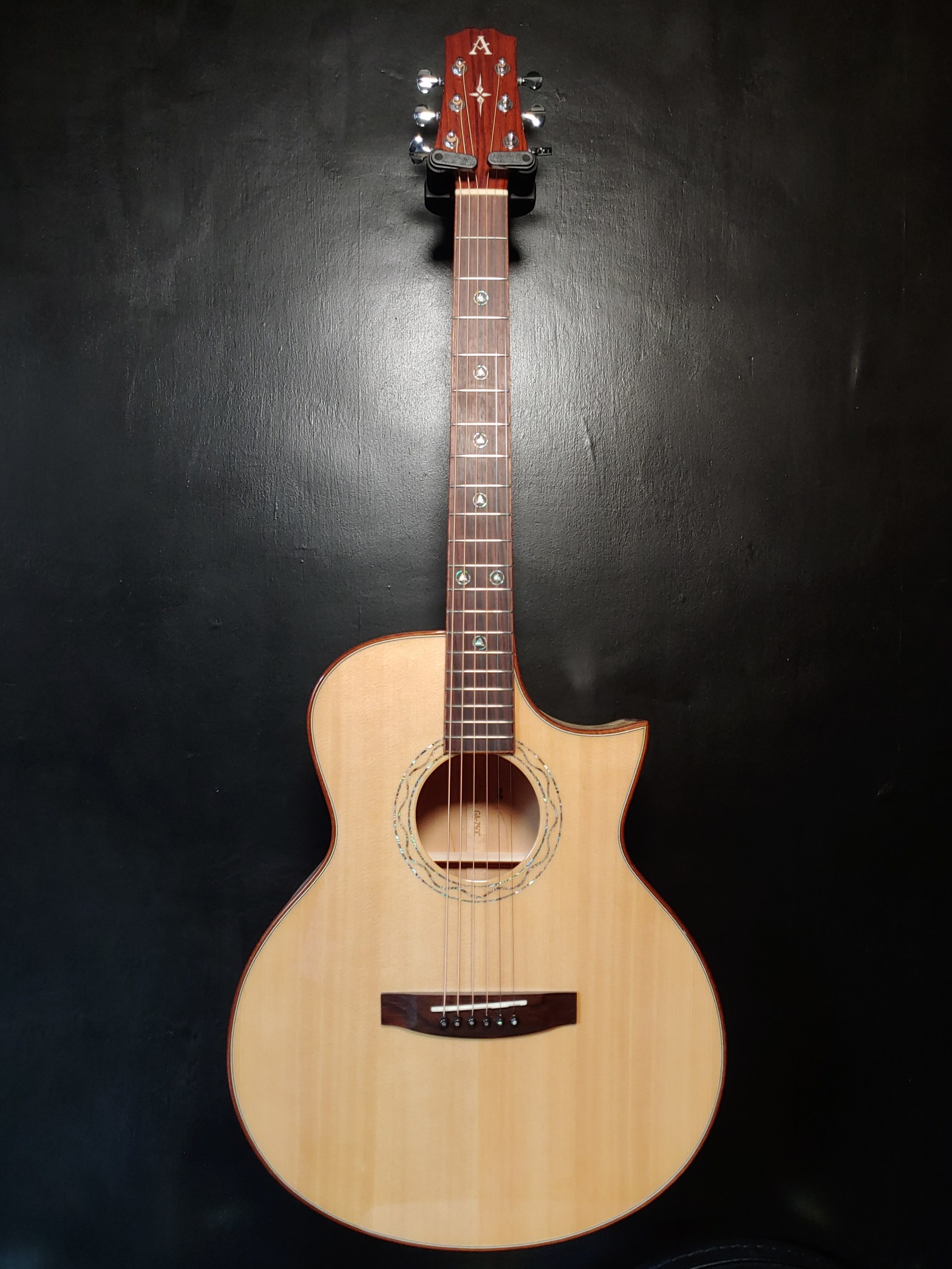 Made from Solid Spruce Top along with selected Tiger claw Maple back and sides, this Grand Auditorium body shape guitar feature a contemporary look with the Florentine Cutaway. The sweet sound and balanced tone produced by the body shape and wood materials allow the guitarist to play solo fingerstyle and strumming for singing.